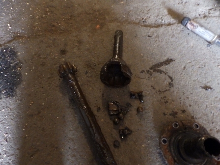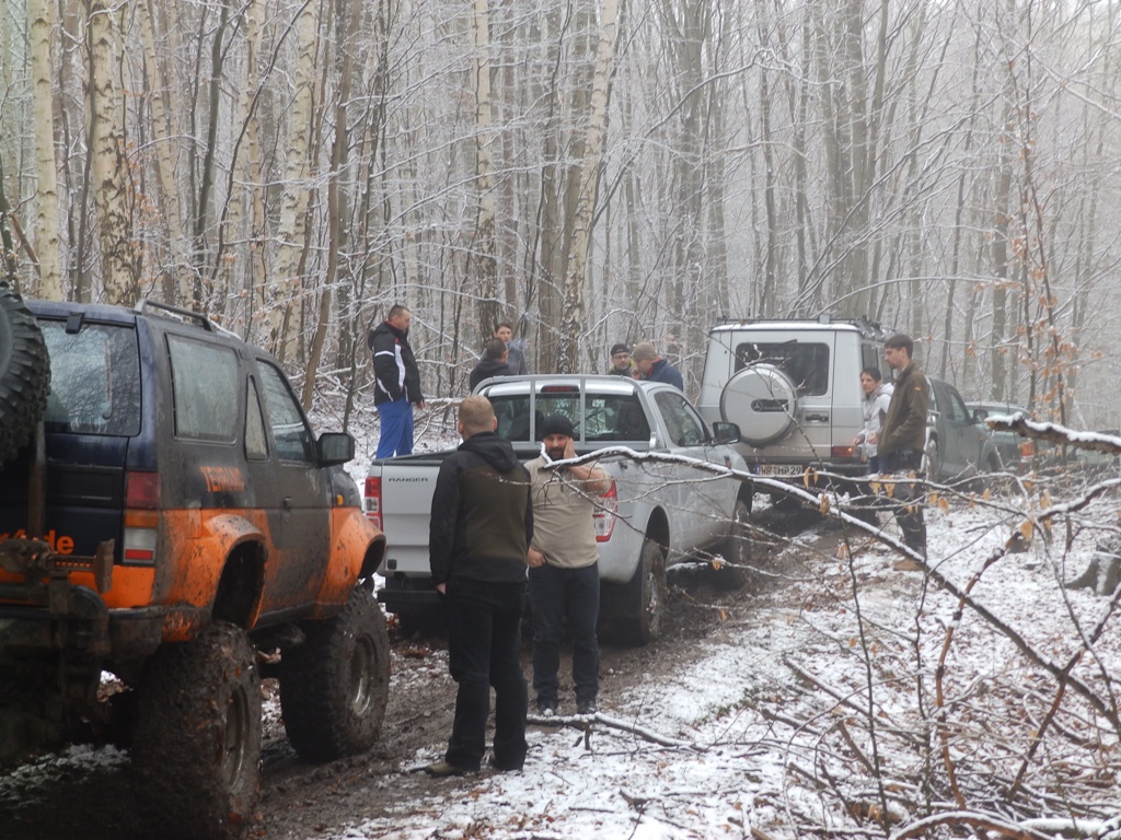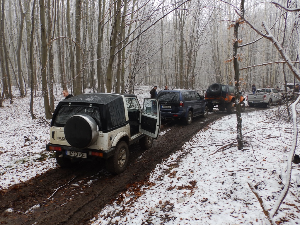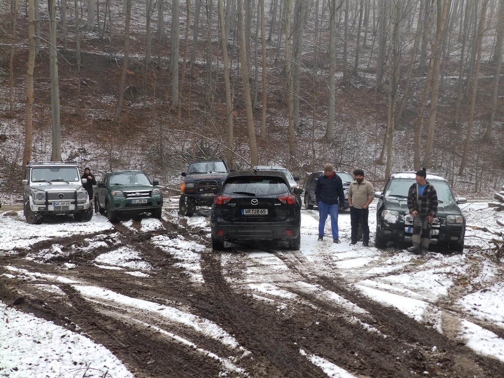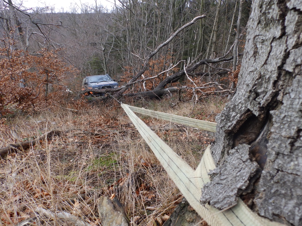 Und genau diese Extratouren, sind die besten und schlimmsten Touren. Was man hier auf den Bildern nicht sieht, ist die Steigung und daß die Fahrspur rechts am Baum vorbei führen sollte. Der Spur zu folgen war kein Problem, doch das Abbiegen und über einen zusätzlichen Absatz, war nicht die beste Idee. Nach einem lauten Knall aus der Vorderachse, war klar, daß das eine vordere Steckachse war. Wir rutschten sofort seitlich weg und krachten in die Bäume hinter uns. Nun stand der Terrano, wie angewurzelt. Für die Bergung mussten wir das Fahrzeug mit der Seilwinde sicher und weiter den Berg hoch ziehen. Alles was nun hinter uns störte wurde beseitigt und wir konnten den Terrano am Seil bis auf die nächste Ebene abseilen. Die Probleme waren damit aber noch nicht vorbei, denn die zerbrochenen Einzelteile der Steckachse blockierten und verhinderten somit das Lenken nach rechts. Ich hatte überlegt die Achse vor Ort zu zerlegen, doch ich entschloss mich auf gut Glück, ohne Allrad und nur mit links lenken und häufiges zurücksetzen ins Tal hinunter zu fahren.