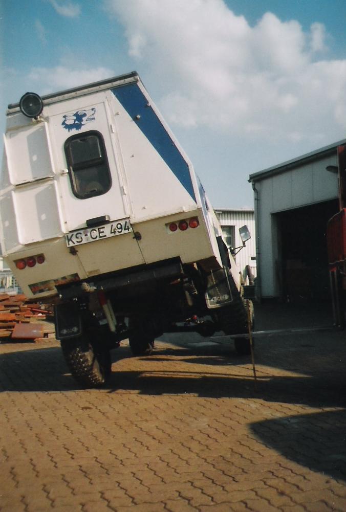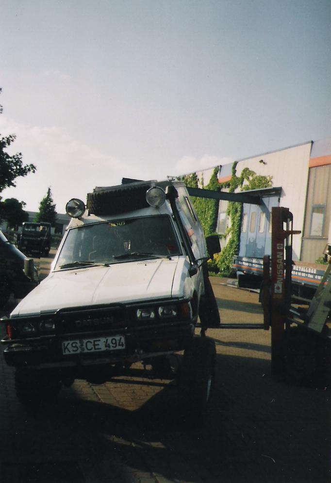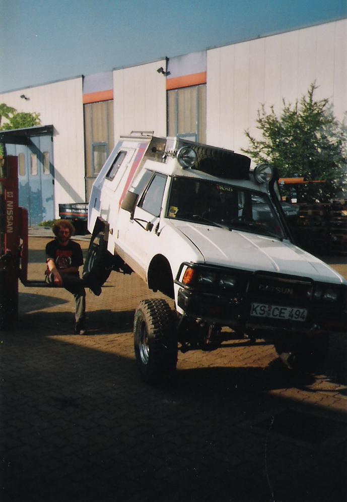 Irgendwann im Sommer 2005 klingelte das Telefon und der Stefan ,den ich bis dahin nicht kannte ,war dran .Er informierte sich über meinen Terrano und ob das bei einem Nissan Y720 auch möglich wäre und da diese Fahrzeuge recht selten sind in Deutschland ,lud ich Ihn nach Wernigerode ein .Kaum ausgesprochen stand der Stefan auch schon vor mir .Wir schauten uns den Fahrzeugrahmen an und kamen zu dem Entschluss "Ja ,das müsste gehen!" . Da der Stefan sehr viel alleine macht an seinem Fahrzeug brachte er mir nur einen leeren Leiterrahmen ( mit Verteilergetriebe ) und nackte Achsen vom Patrol .Nach den Anpassungen ,Aufarbeitung und Verzinkung des Leiterrahmens kam es zu Montage des Fahrgestelles mit Verteilergetriebe, Lenkung, Blattfedern, Achsen und Wellen .So zusammengesetzt ging der Rahmen wieder auf Reise in die Heimat, nach Kassel ,wo er schon sehnsüchtig erwartet wurde .In einer wirklich bemerkenswerten Zeit baute Stefan den Y720 wieder zusammen und bereitete ihn für die TÜV-Abnahme vor . Eckdaten : -2,4l Nissan Terrano Motor mit Vergasertechnik -Blattfederfahrwerk -Selbstsperrende Diff.vorn und hinten -Achsübersetzung 4.88 -Wohnmobilaufbau -31 x 10,5 / 15 Kuhmo